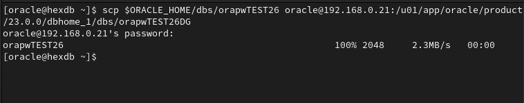 scp $ORACLE_HOME/dbs/orapwTEST26 oracle@192.168.0.21:/u01/app/oracle/product/23.0.0/dbhome_1/dbs/orapwTEST26DG